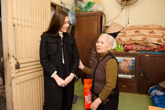 Nàng hậu trẻ với nụ cười rạng rỡ, ấm áp đã đến gõ cửa từng nhà, trao tặng từng phần quà, mang Tết và mang yêu thương đến gần hơn với những người có hoàn cảnh khó khăn hơn mình.