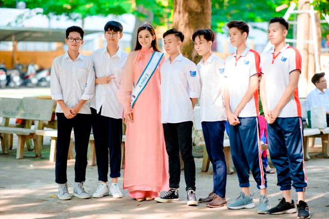 Sân trường THPT Phan Đình Phùng dường như trở nên náo nhiệt và đầy hào hứng hơn bao giờ hết trước sự xuất hiện của nàng Á hậu xinh đẹp.