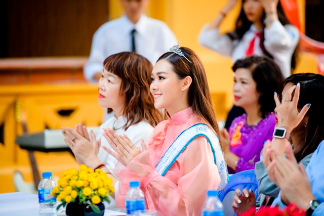 Á hậu đã gặp lại cô giáo cũ và gửi tặng gửi tặng một phần học bổng vào quỹ nhà trường, đồng thời phát biểu cảm nghĩ và chia sẻ cảm xúc của mình đến toàn thể học sinh của ngôi trường này.