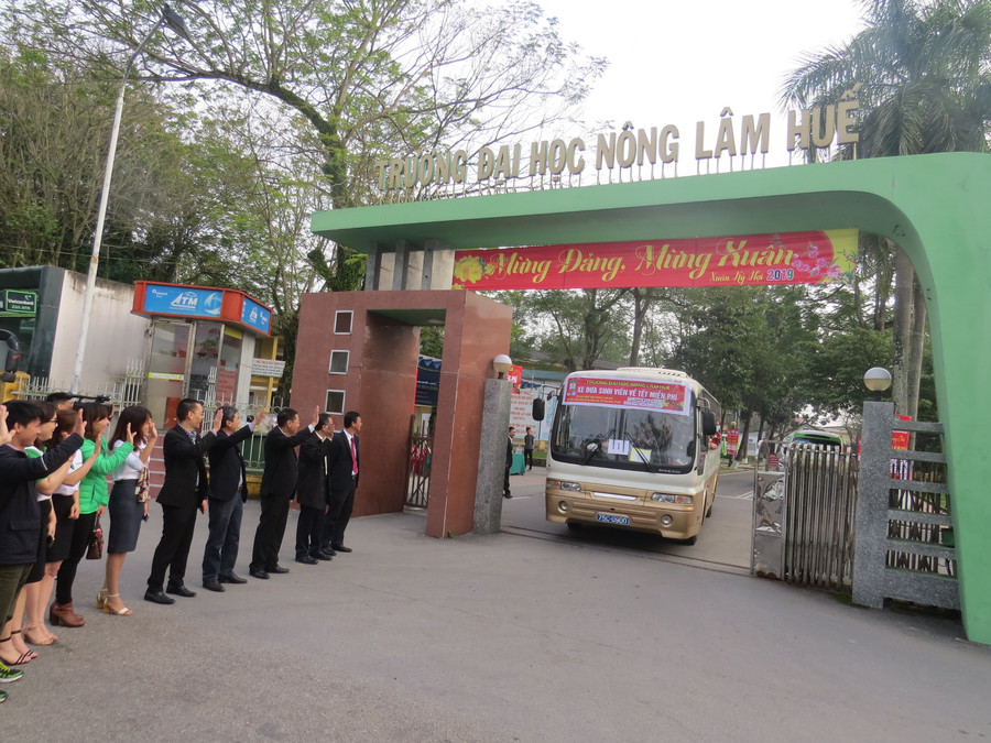 Chương trình xe đưa sinh viên về quê nghỉ Tết miễn phí được trường ĐHNL Huế xác định như một hoạt động ý nghĩa, mang tính thiện nguyện được tổ chức hằng năm nhằm mang tới cho các em sinh viên một kỳ nghỉ Tết Nguyên Đán ấm áp, vui vẻ và hạnh phúc cùng gia đình. Dịp này, nhà trường tổ chức 10 chuyến xe để đưa đón gần 500 sinh viên về quê các tỉnh miền Trung và Tây Nguyên, đồng thời trao 250 suất quà Tết (100.000/suất quà) cho các sinh viên chế độ chính sách, hoàn cảnh khó khăn, vươn lên trong học tập...