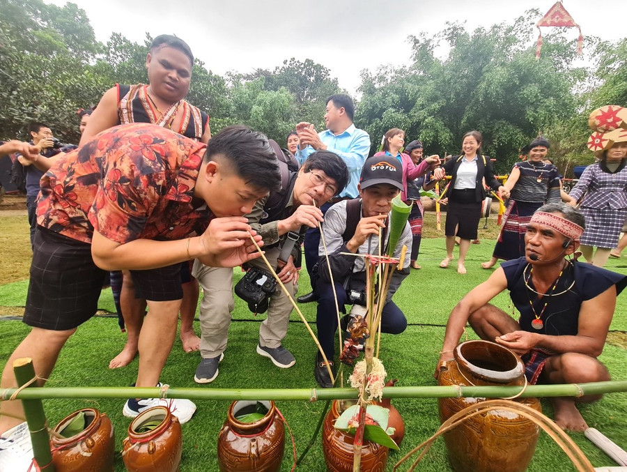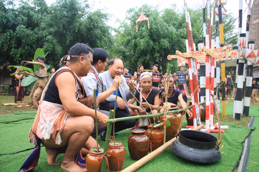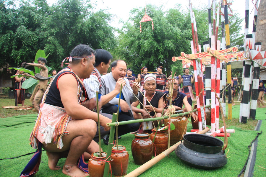 | Già làng và bà con dân làng bắt đầu hòa nhập vào không khí phần hội uống rượu mừng lễ cầu an đã xong. Những tiếng hò reo, mời mọc, chúc tụng nhau cùng với những điệu múa xoang, hòa quyện với nhịp cồng chiêng hào hùng của các chàng trai và điệu múa của các cô gái,cùng du khách càng tăng thêm sự nhộn nhịp, sôi động của lễ hội. |