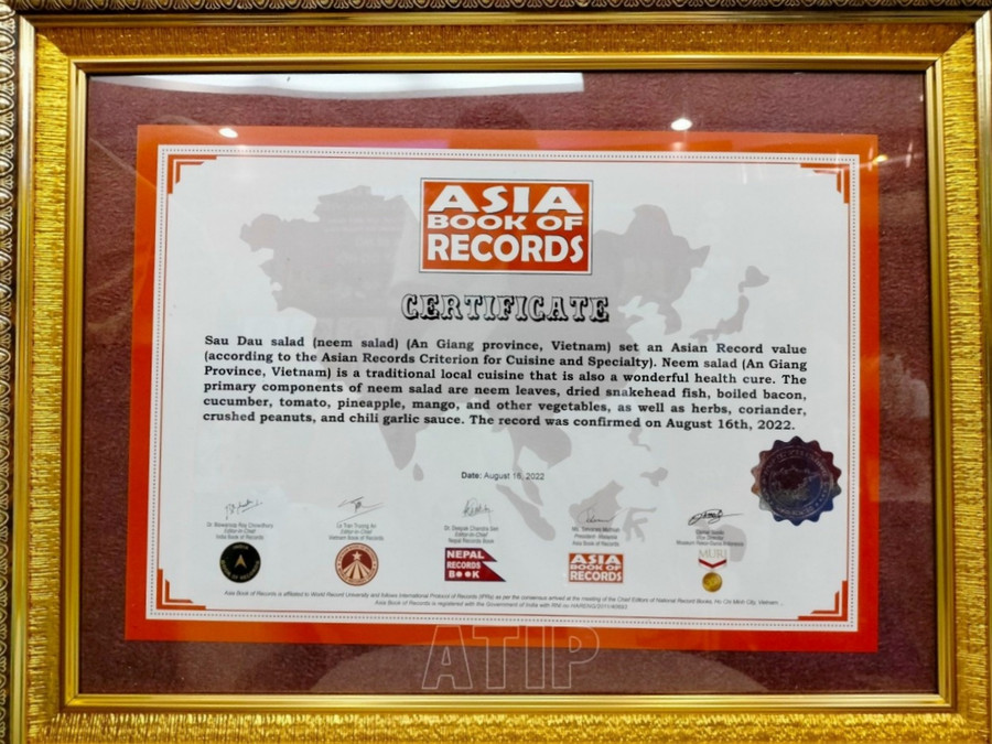 | Bằng xác lập kỷ lục Châu Á về giá trị ẩm thực "Gỏi sầu đâu" và "Cơm tấm Long Xuyên" của An Giang. |