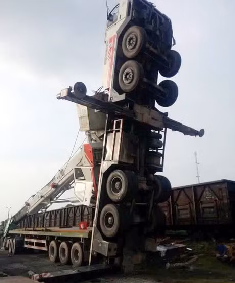 Pha "bốc đầu" nguy hiểm của cần cẩu. Ảnh: Tuấn Phạm.
