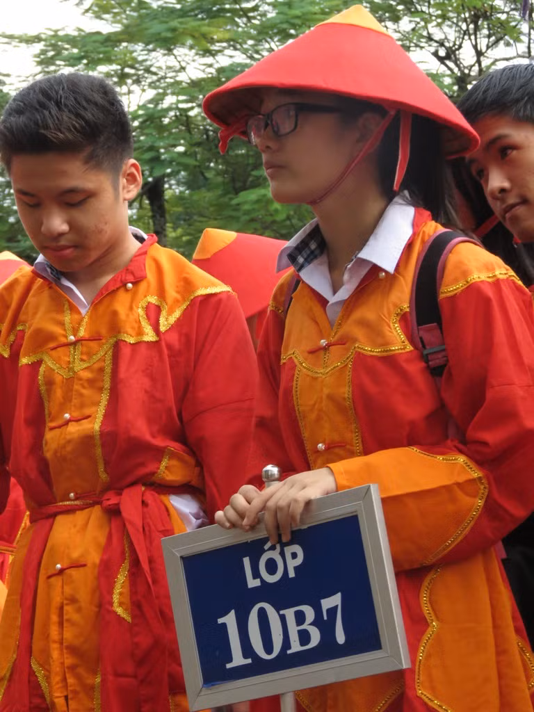 | Học sinh mặc trang phục áo lính tại buổi ngoại khóa |