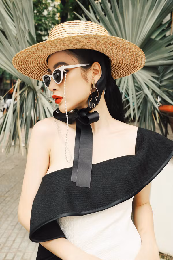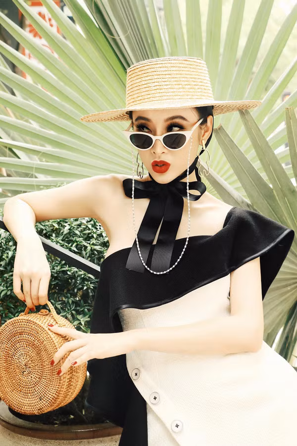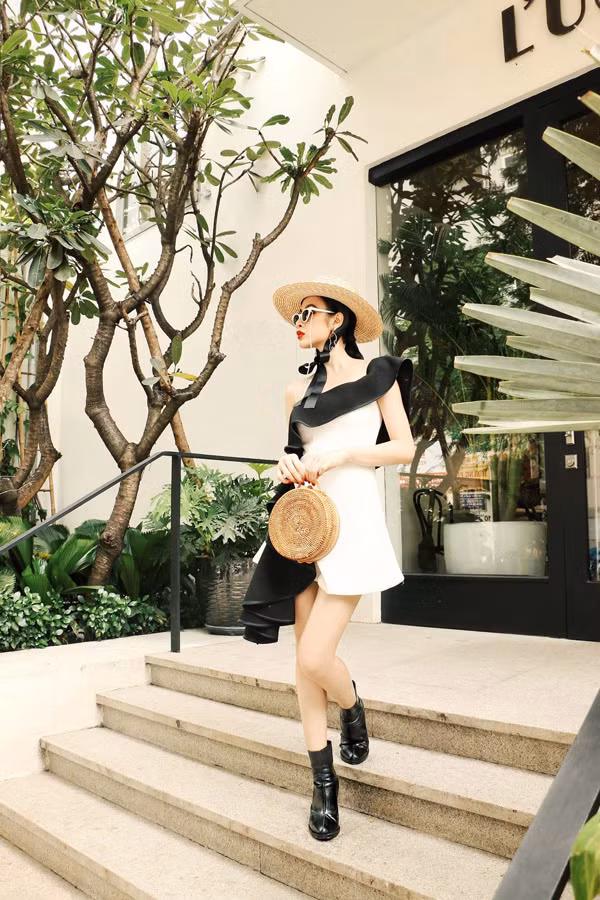 Trong bộ cánh đầu tiên, Angela Phương Trinh diện váy trắng với điểm nhấn là diềm bèo bất đối xứng của NTK Lý Giám Tiền, kết hợp ăn ý cùng kính mắt mèo cổ điển. Sự tinh tế trong việc lựa chọn phụ kiện của nữ diễn viên thể hiện ở chiếc mũ cói buộc dây ăn ý cùng túi xách cói tròn.