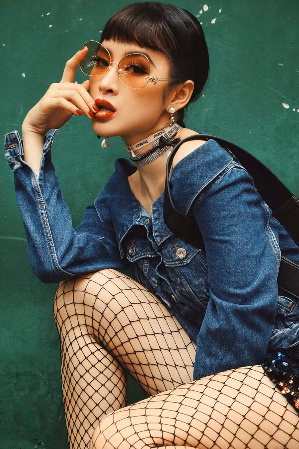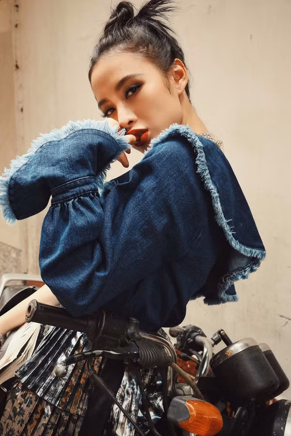 Một gợi ý khác của Angela Phương Trinh khi diện áo khoác denim là phối cùng váy nhung hai dây, tạo hình ảnh đầy quyến rũ và cực hợp với thời tiết thu.
