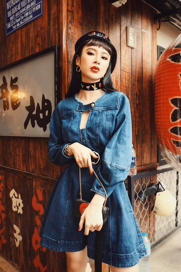 Bên cạnh những đôi giầy mũi nhọn đặc trưng cùng những túi xách mini sành điệu của Christian Louboutin, váy denim là một trong những chất liệu được lòng Angela Phương Trinh nhất.