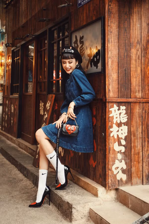 Kiểu trang phục này được cô nàng diện rất tích cực vì có thể "thiên biến vạn hóa" nhiều cách phối. Diện áo denim với váy xòe và tất lưới, nữ diễn viên trông đáng yêu. Phối váy denim cùng mũ beret, choker bản to, người đẹp như bước ra từ thập niên 80.
