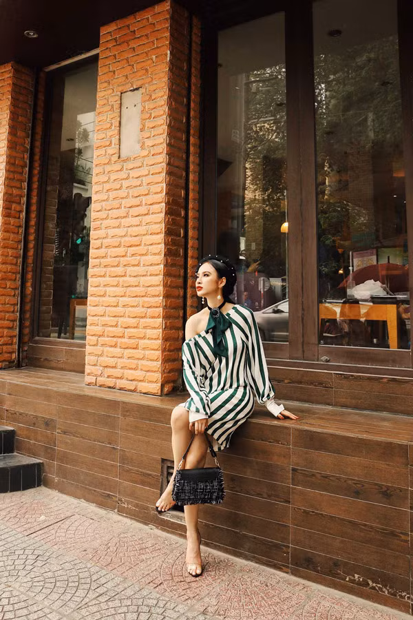 Hình ảnh một nàng tiểu thư cổ điển mà vẫn trẻ trung tiếp tục được Angela Phương Trinh truyền tải trong bộ váy kẻ sọc xanh ngọc lục bảo, nhấn nhá với nơ buộc cổ đầy sang trọng.