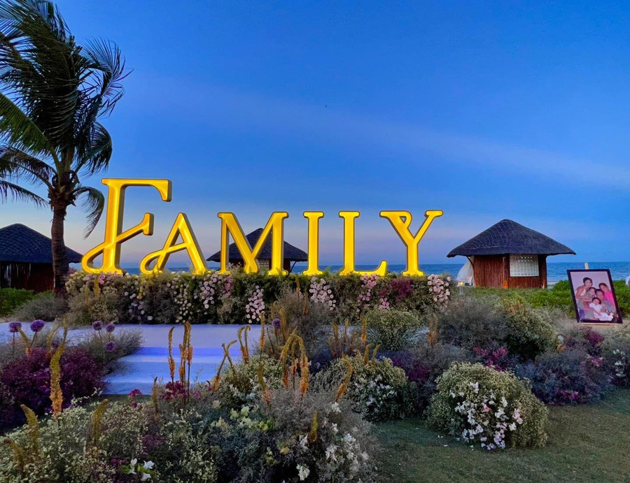 Đặc biệt, giữa không gian tiệc có đặt dòng chữ to "Family", ngoài ra những bức ảnh đẹp của cả nhà cũng được bày trí khắp nơi cùng ảnh cô dâu chú rể.