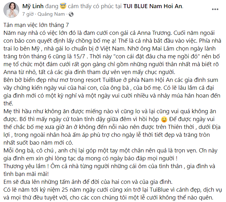 Chia sẻ về hôn lễ nhỏ gọn của con gái tại Việt Nam, diva Mỹ Linh thổ lộ: "Cuối năm ngoái con bảo con quyết định lấy chồng bố mẹ ạ. Thế là cả nhà bắt đầu vào việc, phía nhà trai lo bên Mỹ còn nhà gái lo chuẩn bị ở Việt Nam. Bố mẹ tổ chức một đám cưới rất gọn gàng chỉ gồm những người thân nhất mà biết rõ Anna từ nhỏ, tất cả các gia đình tham dự vẻn vẹn mấy chục người.