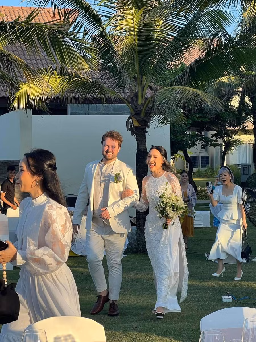Con rể của diva Mỹ Linh diện vest trắng để sánh đôi bên Anna Trương, cặp đôi trao nhau ánh nhìn tình tứ đáng ngưỡng mộ.
