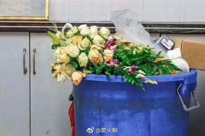 Hình ảnh những bông hoa đỏ thắm vẫn còn rực rỡ bên trong hoặc cạnh thùng rác khiến nhiều kẻ cô đơn phải tiếc hùi hụi vì "kẻ ăn không hết, người lần chẳng ra".