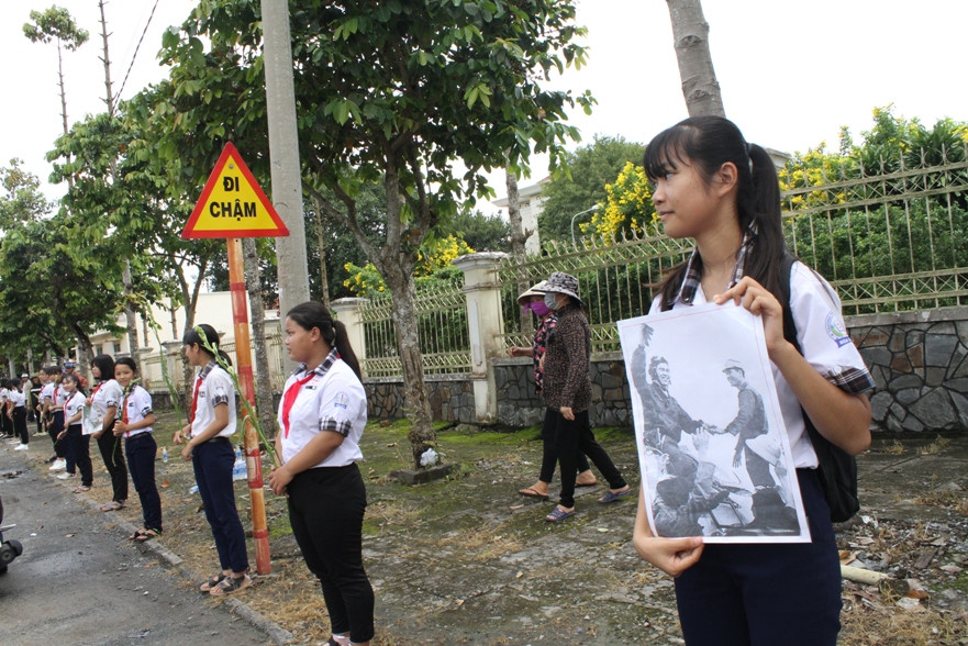 Hình ảnh thầy cô giáo, các em học sinh cầm trên tay hình ảnh của vị anh hùng đứng hai bên đường khiến nhiều người xúc động. Đó không chỉ là những tấm ảnh một thời oanh liệt mà còn là hình ảnh đời thường của vị anh hùng phi công gắn bó với bà con, xóm làng.