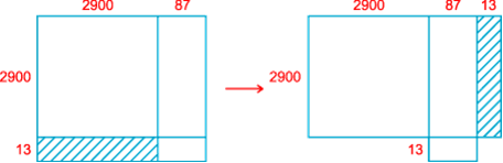 Thể hiện nhận xét đó trên hình vẽ thì kết quả cần tìm chính là diện tích hình chữ nhật có cạnh 2987 và 2913. Và, do đó có thể chuyển hình chữ nhật nhỏ (có cạnh chéo) sang vị trí mới như hình vẽ: