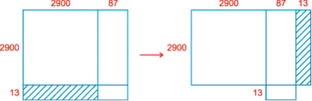 Thể hiện nhận xét đó trên hình vẽ thì kết quả cần tìm chính là diện tích hình chữ nhật có cạnh 2987 và 2913. Và, do đó có thể chuyển hình chữ nhật nhỏ (có cạnh chéo) sang vị trí mới như hình vẽ: