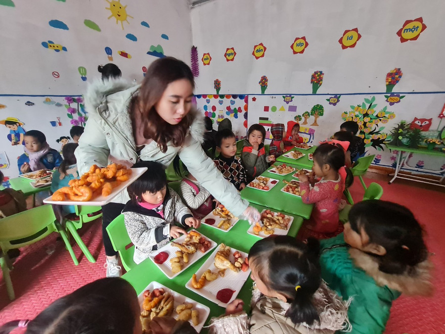 | Cô và trò Trường Mầm non Du Tiến chờ nhận quà từ chương trình “Áo ấm vùng cao”. |