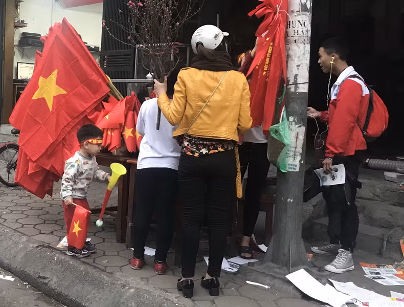Có thể dễ dàng mua cờ, áo cỗ vũ và các miếng dán trên khắp các tuyến phố ở Hà Nội