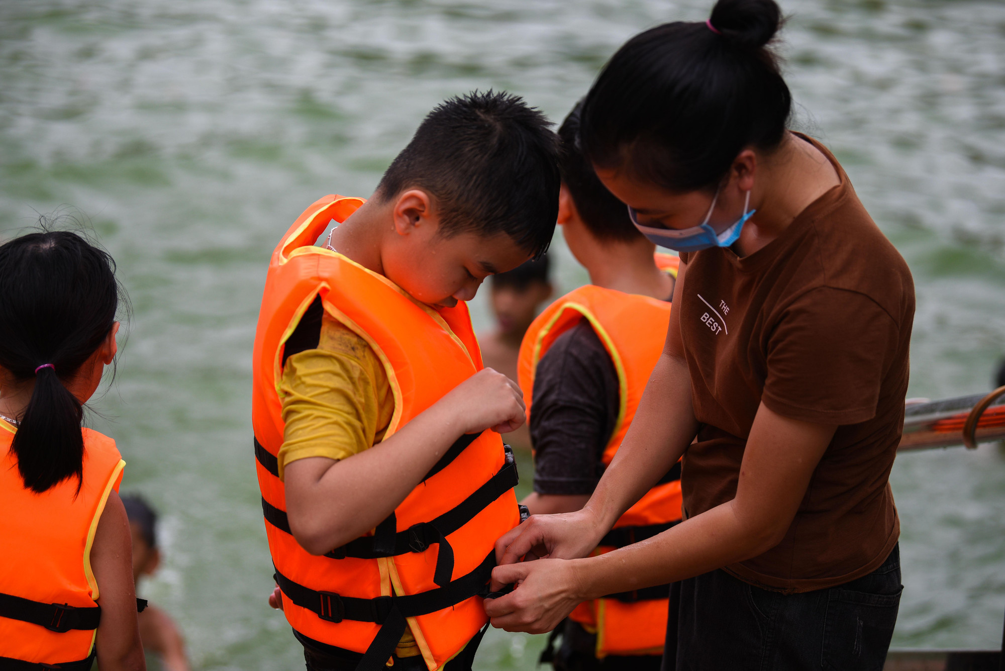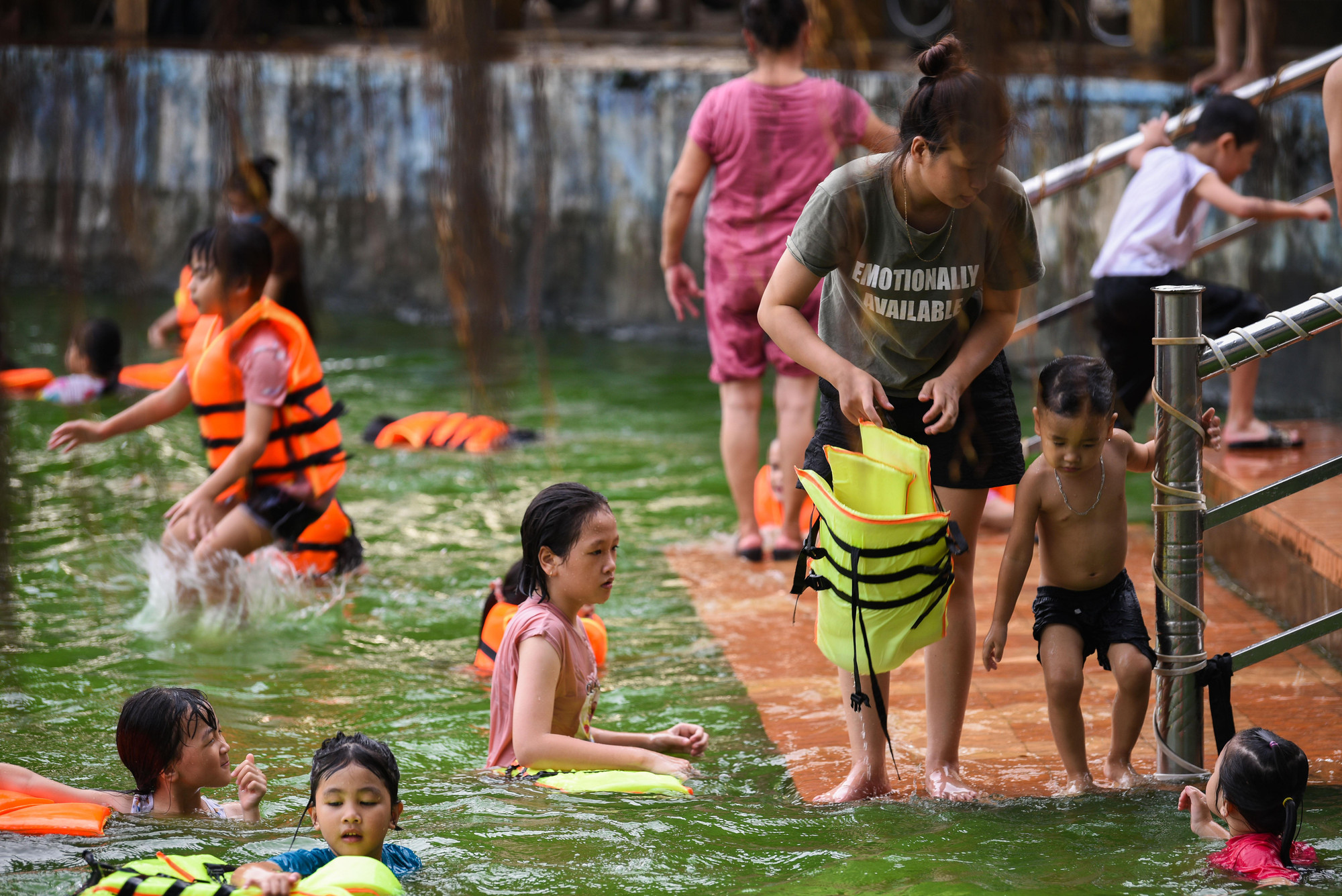 | Ở đây, trẻ em được phụ huynh dẫn đi tắm mát, lứa tuổi dao động từ 5-15 tuổi. Các em nhỏ dưới 10 tuổi được bố mẹ sắm áo phao đầy đủ. |