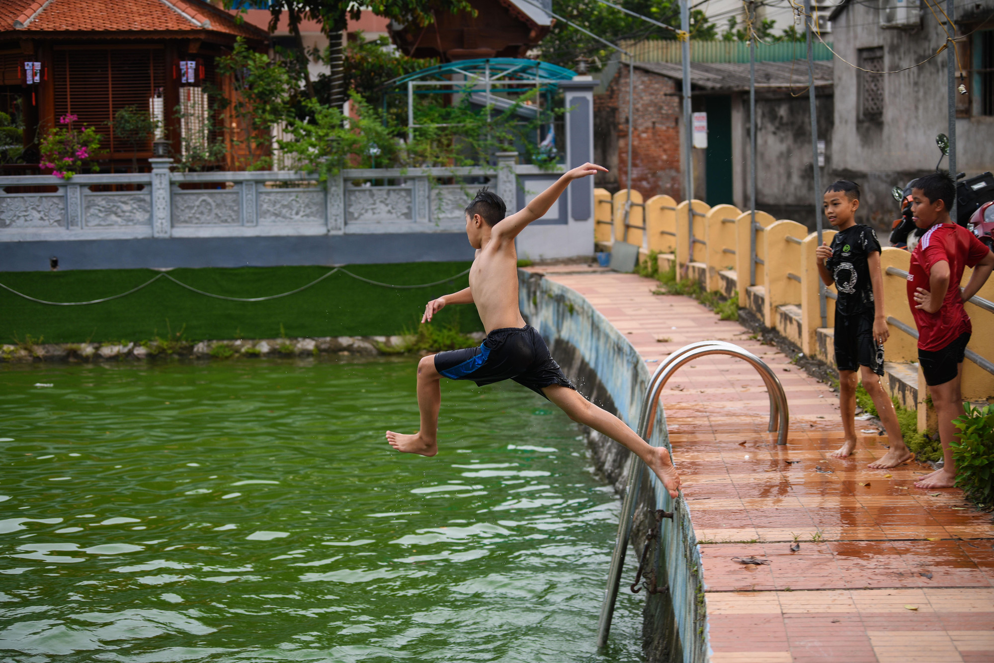 | Chị Trang, người làng Yên Trường cho biết: 'Mùa hè, các cháu không phải đi học, chiều nào tôi cũng cho cháu ra đây tắm, tập bơi. Tôi cho cháu tắm vừa để cháu được học bơi tự vệ, vừa để rèn luyện để có sức khỏe tốt. Nơi đây cũng là nơi trẻ nhỏ của cả làng tụ tập mỗi buổi chiều nên việc vệ sinh tại đây được nhiều người dân rất để ý.' |