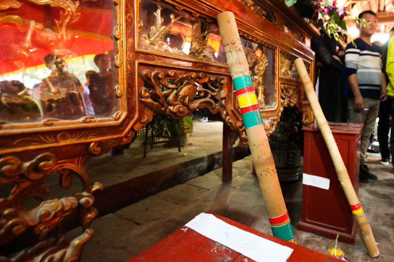| Ngay sau khi cây bông tre được mang ra ngoài, rất đông thanh niên đã không ngại “thượng cẳng tay, hạ cẳng chân” để mong muốn giành được bông hoa tre và đoạn tre |
