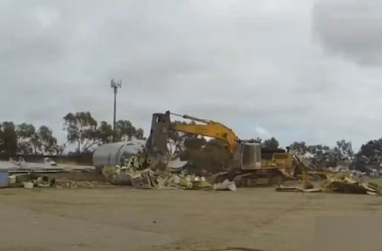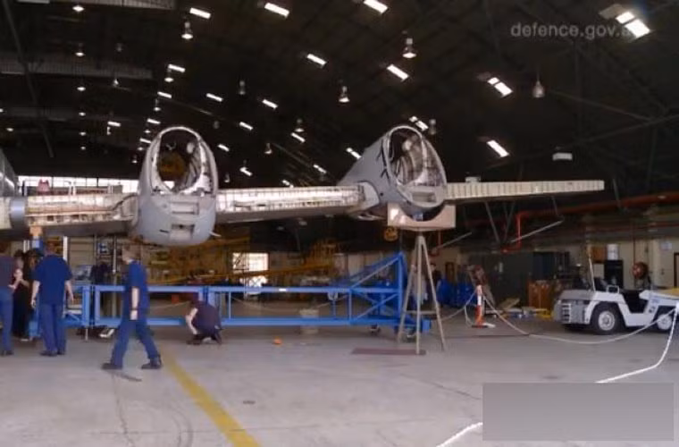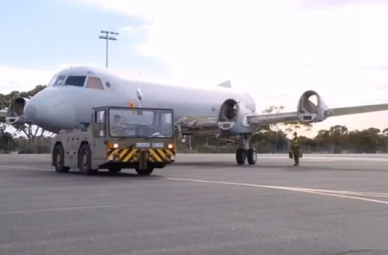 Một máy bay tuần tra chống ngầm P-3C Orion của Hải quân Hoàng gia Australia hết hạn sử dụng được đưa đến một nhà kho để tháo dỡ.