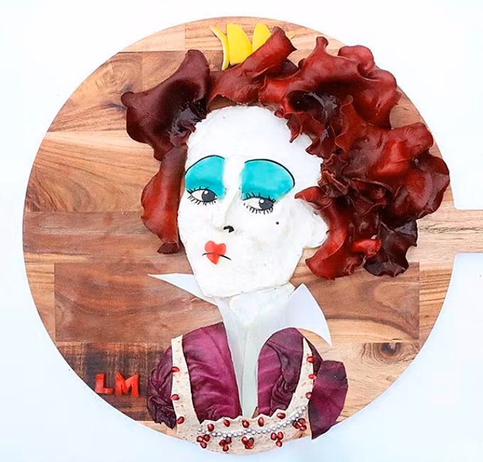Các nhân vật đó không chỉ trông giống với bản gốc mà nó còn là sự kết hợp của những thực phẩm lành mạnh, cân bằng. Ví dụ, bức chân dung cô nàng Helena Bonham Carter trong vai Nữ hoàng đỏ của Alice in Wonderland trông rất kiêu ngạo được làm từ nấm, phô mai kem và bắp cải đỏ.