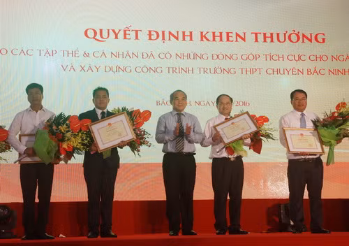 Tại buổi lễ, Thứ trưởng Bộ GD&ĐT Nguyễn Vinh Hiển trao Bằng khen của Bộ GD&ĐT cho các đơn vị, nhà đầu tư đã có đóng góp cho sự nghiệp phát triển GD&ĐT, tỉnh Bắc Ninh đã trao bằng khen cho các đơn vị, tập thể và các cá nhân đã có nhiều đóng góp trong việc xây dựng Trường THPT Chuyên.
