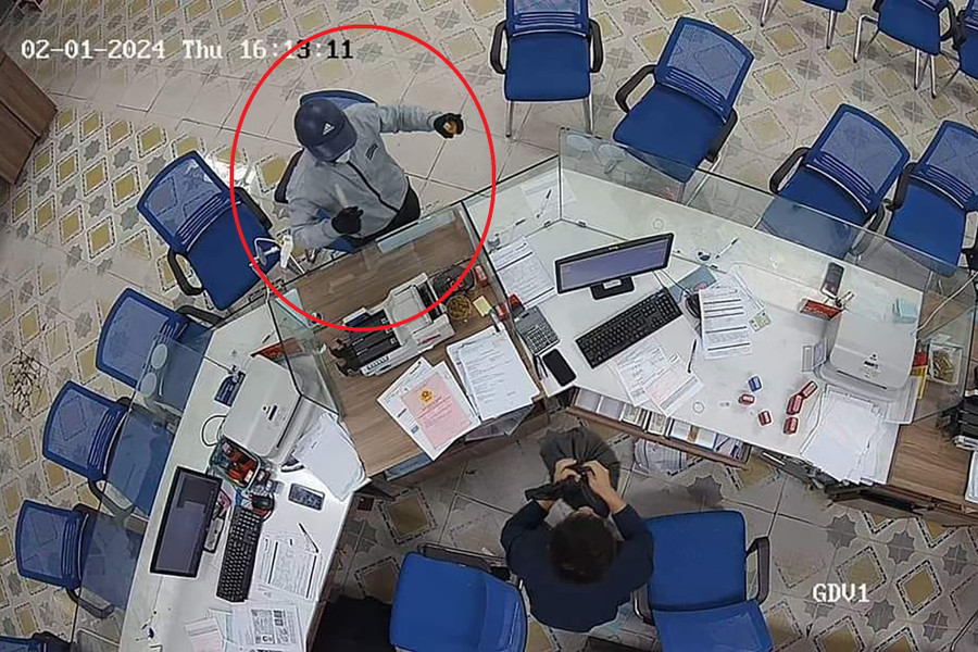 Người đàn ông này đưa lựu đạn hướng vào trong quầy, yêu cầu nam nhân viên lấy tiền bỏ vào túi. Nhân viên ngân hàng lấy tiền trong ngăn kéo bỏ vào túi, sau đó ngồi xuống lấy tiền trong túi bỏ ra ngoài, lấy giấy rác bỏ vào.