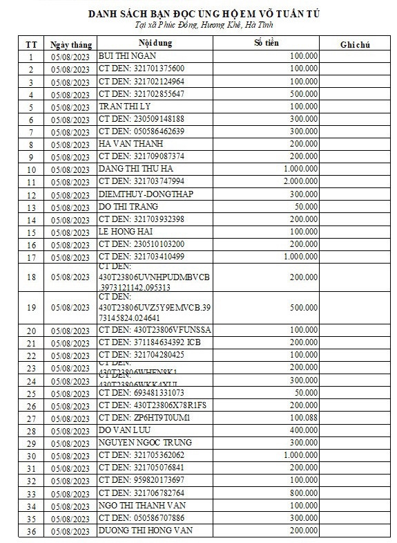 Dưới đây là danh sách bạn đọc ủng hộ qua tài khoản của văn phòng Báo GD&TĐ khu vực Bắc Trung Bộ (từ ngày 5/8/2023 - 7/8/2023).