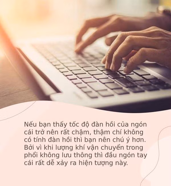 Nhưng nếu bạn thấy tốc độ đàn hồi của ngón cái trở nên rất chậm, thậm chí không có tính đàn hồi thì bạn nên chú ý hơn. Bởi vì khi lượng khí vận chuyển trong phổi không lưu thông thì đầu ngón tay cái rất dễ xảy ra hiện tượng này.