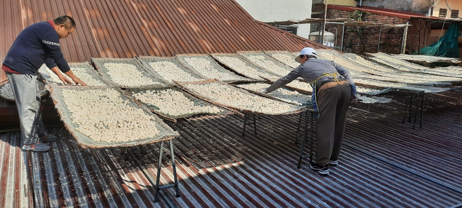 Những viên bánh sống được xếp trên giàn đem phơi thật khô, mất chừng 10 ngày. Mẻ bánh ngon hay không phụ thuộc nhiều vào thời tiết, nếu trời có gió bấc, hanh hao thì bánh khô nỏ, ăn sẽ giòn, xốp tan trong miệng.