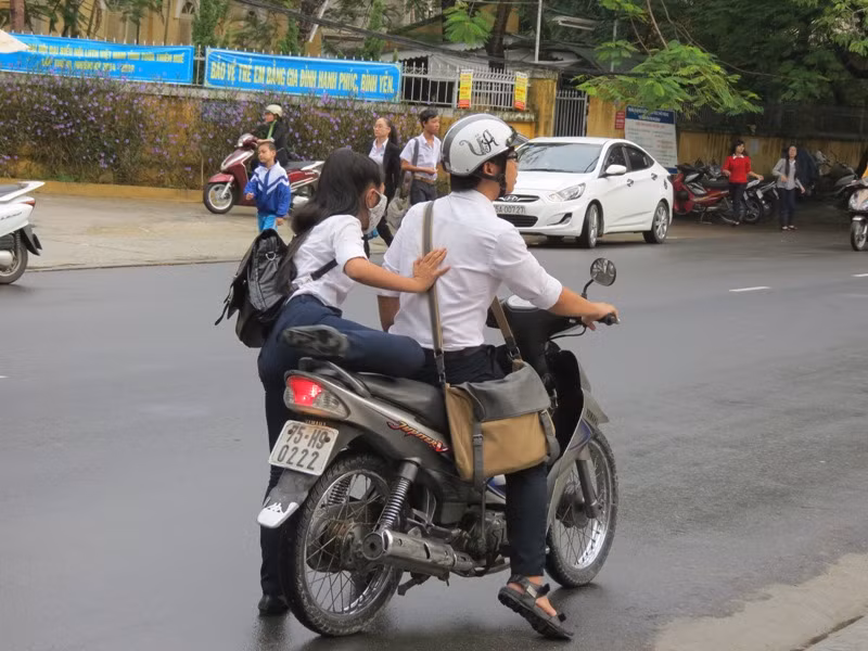Cá biệt, một số học sinh còn không đội mũ bảo hiểm khi ngồi trên xe máy. Sau tan học, các em điều khiển xe máy một cách vô tư, đùa giỡn nói chuyện khi tham gia giao thông.