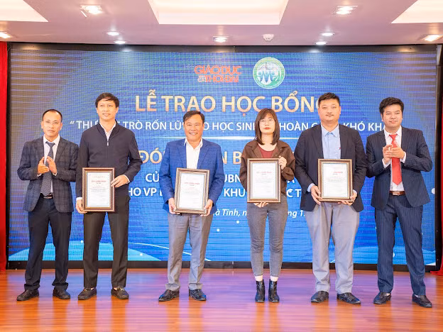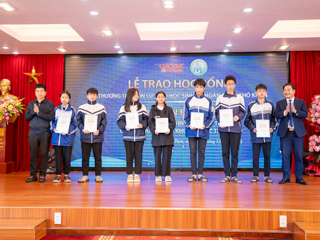 | Văn phòng Báo GD&TĐ cùng lãnh đạo tỉnh Hà Tĩnh, các sở ban ngành, nhà tài trợ trao học bổng "Thương trò rốn lũ" đến 38 em học sinh trên địa bàn. |