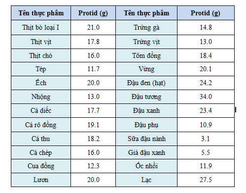 (Hàm lượng protein trong 100 g thực phẩm ăn được)