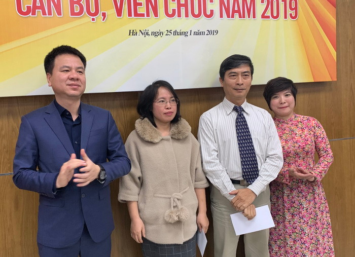 Tổng biên tập Triệu Ngọc Lâm (trái), Phó Tổng biên tập Dương Thanh Hương (phải) tặng phần thưởng cho các cá nhân đạt thành tích xuất sắc trong năm 2018