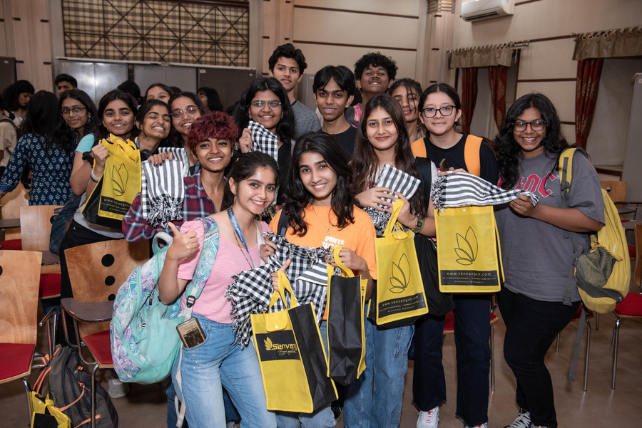 | Sinh viên trường Xavier trước món quà là những chiếc khăn rằn đến từ Việt Nam của Miss Intercontinental Bảo Ngọc. |