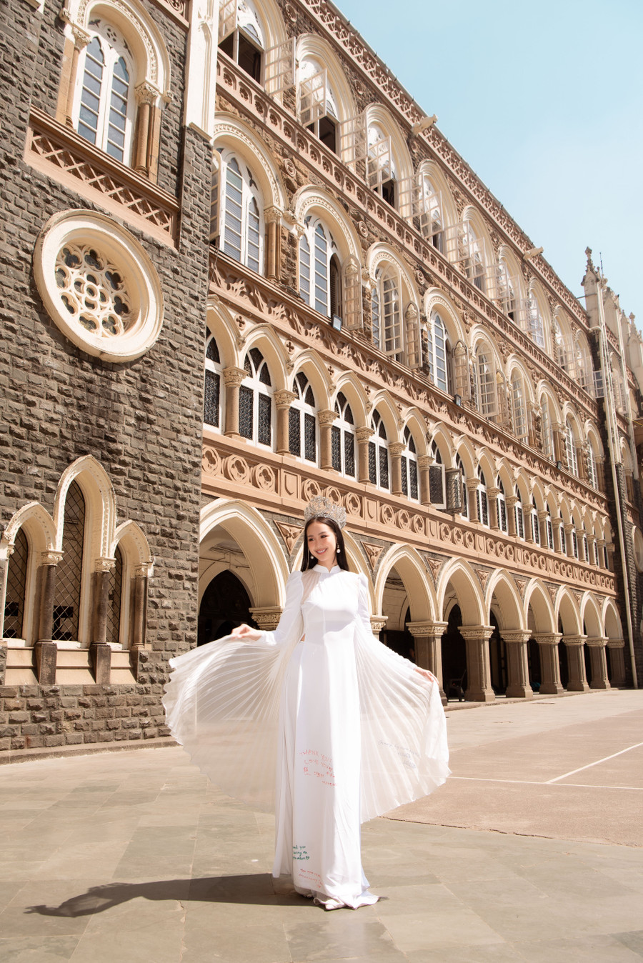 | Tạm gác lại những bộ cánh rực rỡ của nàng hậu Quốc tế, Bảo Ngọc lựa chọn chiếc áo dài trắng đơn giản, phần tà xòe rộng mang niềm tự hào văn hóa Việt Nam đến với sinh viên Quốc tế. |