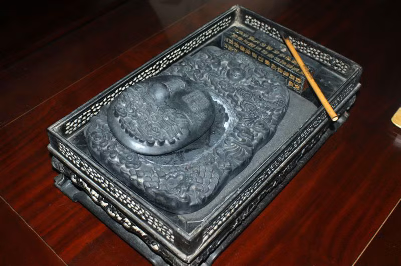 Chẳng hạn như chiếc nghiên mực “Lưỡng long tranh châu” bằng đá đen, cùng một thỏi mực tàu cổ đựng trong khay gỗ mun hay chiếc đĩa đựng thức ăn mà vua chúa thường dùng. Hoặc hai bình rượu nhỏ dưới thời vua Thiệu Trị, ngày xưa vua quan dùng để uống rượu vào mùa lạnh; chiếc khay đựng trầu cau khảm xà cừ…