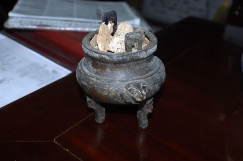 Bộ trà cụ còn có một cây đũa ngà voi dài, một hũ đựng trà bằng gỗ, một độc lư xông trầm, một bếp hỏa lò có phần ruột đựng than để giữ nhiệt nước sôi, một chiếc chậu bằng đồng thau để rửa tay trước khi pha trà.