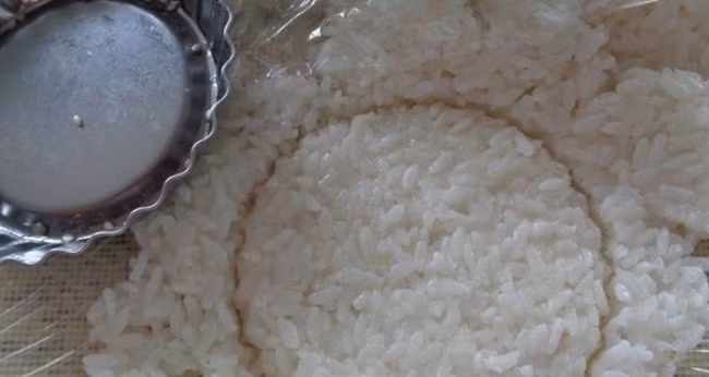Bước 2: Khi cơm chín, các bạn để hơi nguội rồi cho lên màng thực phẩm cán hơi mỏng, sau đó cắt khoanh tròn (bạn có thể dùng khuôn hay miệng ly nước để cắt). Xếp từng khoanh gạo lên khay phơi nắng thật khô hay sấy khô trong lò ở nhiệt độ 100 độ C.