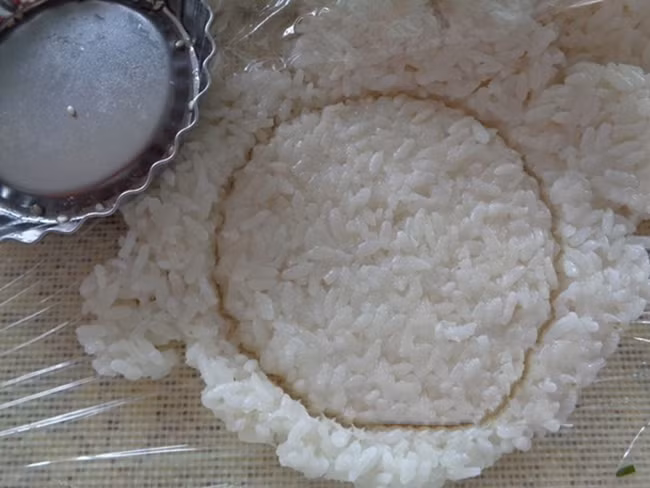 2, Khi cơm chín, các bạn để hơi nguội rồi cho lên màng thực phẩm cán hơi mỏng, sau đó cắt khoanh tròn (bạn có thể dùng khuôn hay miệng ly nước để cắt). Xếp từng khoanh gạo lên khay phơi nắng thật khô hay sấy khô trong lò ở nhiệt độ 100 độ C.