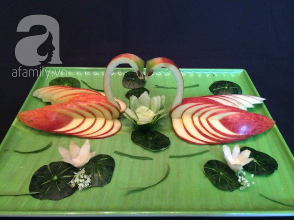 Cặp thiên nga thật đẹp mắt được xếp bằng quả táo với phần cánh được xếp từ những lát táo hình chữ V so le nhau, phần cổ thiên nga dùng 2 miếng táo cắt cong theo dáng của quả táo.