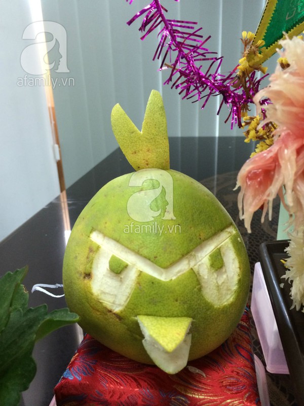 Chú Angrybird được làm bằng quả bưởi và hơi khó hơn một chút, bạn cần vẽ mẫu mặt Angry Birl lên bưởi rồi dùng đầu dao nhọn để cắt đi phần vỏ bưởi làm mắt. Dùng chính phần vỏ này cắt hình chữ V để làm mào và mỏ cho Angry Bird.