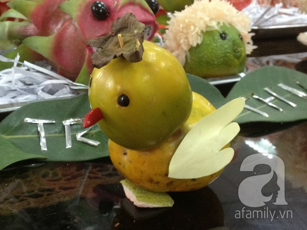 Chú gà con được làm từ quả hồng, đầu gà là 2/3 quả hồng gắn cố định vào thân bằng que nhọn, hai cánh cắt từ giấy màu vàng, mắt bằng hạt nhãn, mũi là quả ớt.