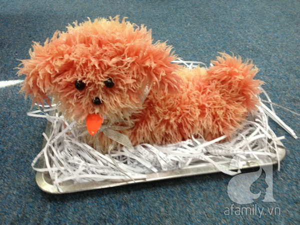 Chú chó con được làm bằng những múi bưởi, thân và đầu bằng cây chuối, mắt và mũi bằng hạt nhãn, thêm nơ ở cổ.