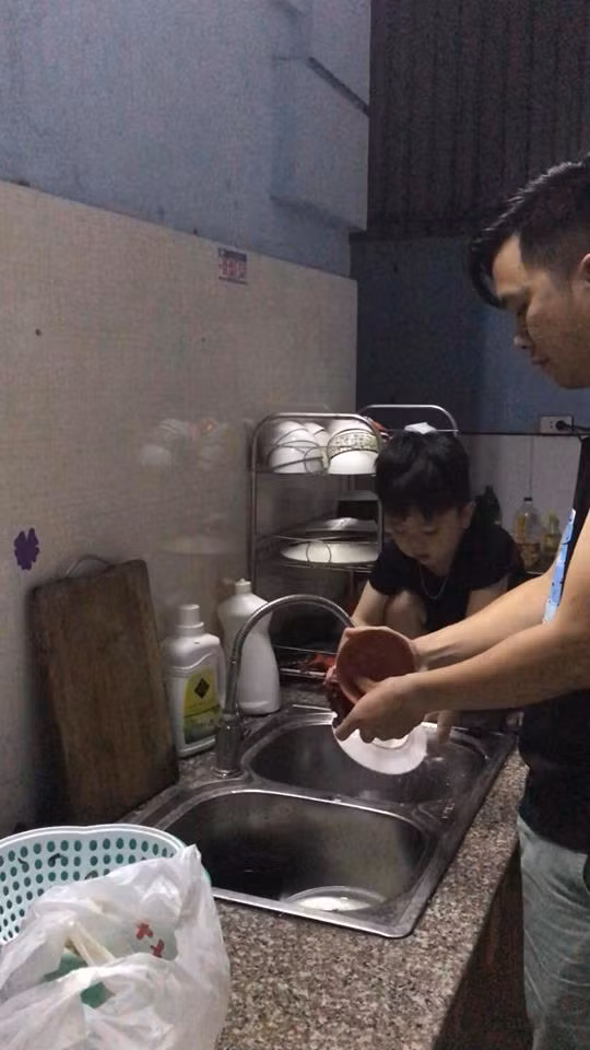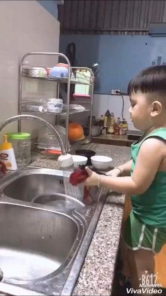 Cậu bé hiện đã có thể rửa bát một cách rất thành thạo.
