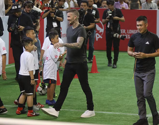 | Buổi giao lưu còn có sự tham gia của cựu danh thủ Lê Công Vinh. Chân sút vàng một thời của bóng đá Việt Nam chia sẻ bản thân là fan lớn của Beckham. Cả hai tỏ ra rất hợp ý khi cùng có sở thích trong công tác đào tạo các tài năng bóng đá trẻ |