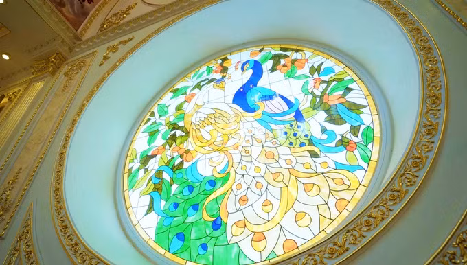 Ở trung tâm lan can là lớp kính xuyên sáng - một chi tiết xuất hiện nhiều ở các công trình nhà tân cổ điển. Chim công được vẽ ở đây thể hiện sự chung thủy, tình cảm vợ chồng bền chặt, không bao giờ chia lìa.