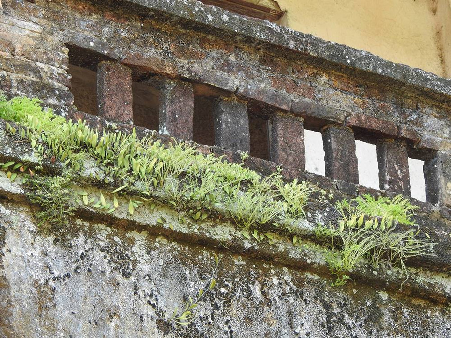 |   Phía sau tòa nhà hai tầng cỏ mọc um tùm, bám vào tường và các cây cột.  |